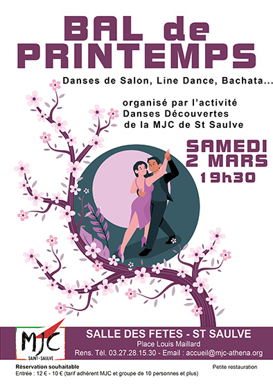 Danses de salon, line dance, Bachata... L'activité Danses Découvertes de la MJC organise son bal de printemps Petite restauration Réservation souhaitable Tarifs : 12€ - 10€ (adhérents MJC et groupe de 10 personnes et plus) Renseignements à la MJC au 03 27 28 15 30 - accueil@mjc-athena.org