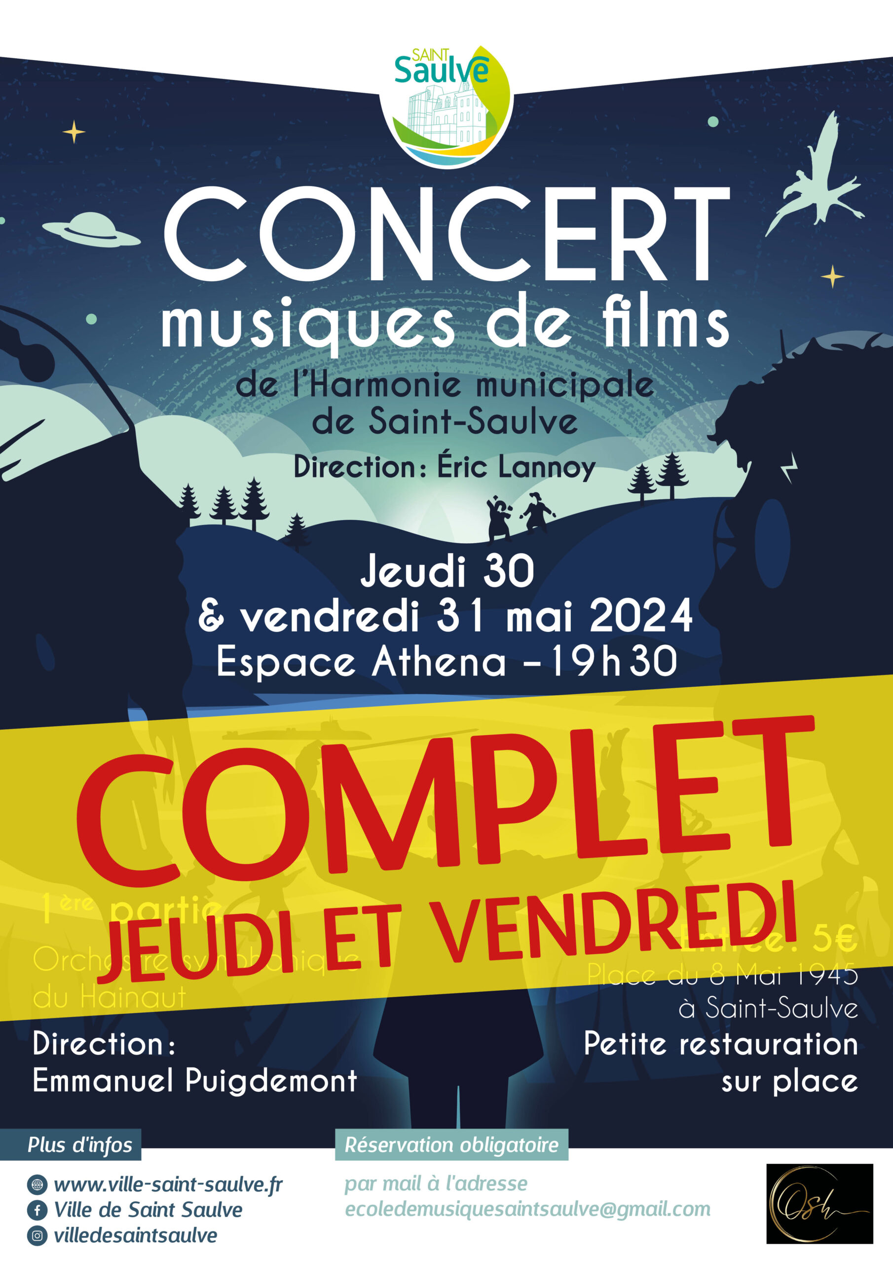 Après le grand succès du concert des musiques Disney, l'Harmonie municipale vous propose un nouveau concert avec en 1ère partie l'Orchestre symphonique du Hainaut. Rendez-vous les jeudi 30 et vendredi 31 mai, à 19h30 à l'Espace Athena. COMPLET le jeudi et vendredi Réservation obligatoire par mail à ecoledemusiquesaintsaulve@gmail.com Entrée : 5€ Petite restauration sur place
