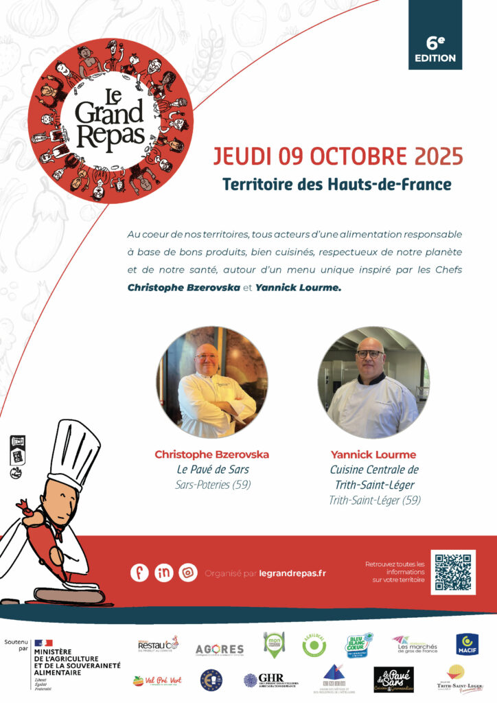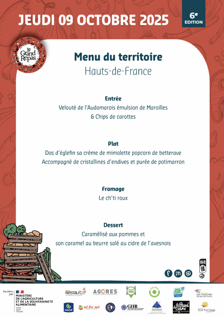 Une fois par an, et pour la 6eme fois, l’association Le grand repas propose aux acteurs de la restauration collective et traditionnelle d’une même région de partager le même menu, le même jour. Chaque menu est concocté par un.e chef.fe du secteur, sur la base des produits locaux et de saison. 🥕